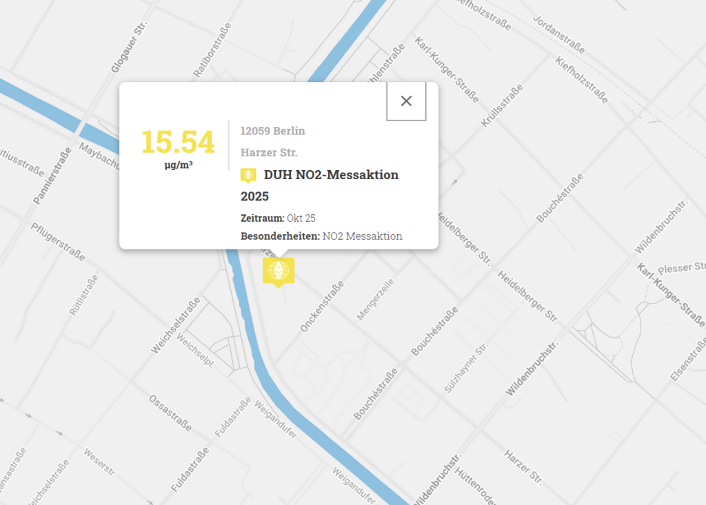 Unsere Initiative hatte die Gelegenheit bei der Messaktion „Decke auf, wo Atmen krank macht“ der Deutschen Umwelthilfe (DUH) teilzunehmen. Im Oktober 2025 haben wir die Belastung der Atemluft mit dem Dieselabgasgift Stickstoffdioxid (NO2) auf Höhe der Harzer Str. 2 (Ecke Lohmühlenstraße) gemessen. Der gemessene Mittelwert liegt bei 15,540 µg /m³ NO2. Der Messwert liegt zum Glück noch unterhalb des ab 2030 geltenden EU-Grenzwerts von 20 µg/m³, überschreitet aber den Richtwert der Weltgesundheitsorganisation (WHO) von 10 µg/m³ deutlich. Wissenschaftliche Studien zeigen eindeutig, dass bereits Konzentrationen von 10 µg/m³ nachweislich gesundheitsschädlich sind. Die Ergebnisse aller Messstationen sind auf einer interaktiven Abgasalarm-Karte hier einsehbar.